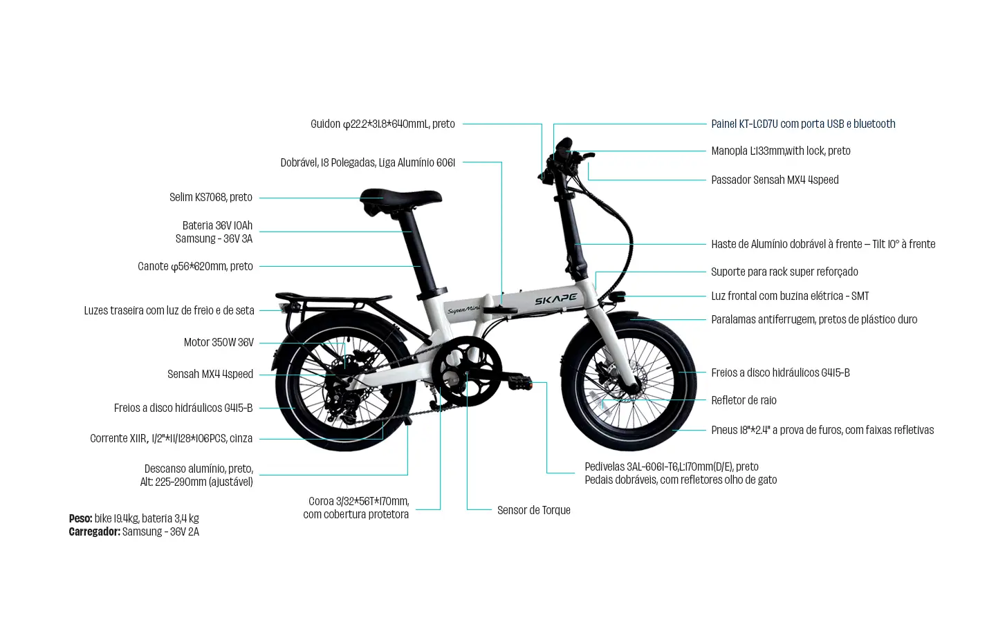 Capacidade de carga 100kg (condutor + carga)